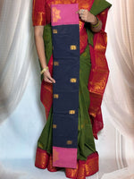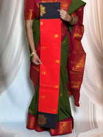 - Madurai Sungudi Cotton Saree featuring a Poonam body Butta, complemented by a matching Constrast-colored Seperate blouse and a Constrast zari border