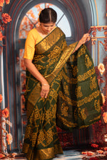 Madurai Sungudi Cotton Poonam with Wax (Batik) Print Kolam Design with Zari Border & Blouse. First Quality, Comfortable and Rich look, with Blouse. Hand printed and hand dyeing using the natural dyes.Hand printed and hand dyeing using the natural dyes.